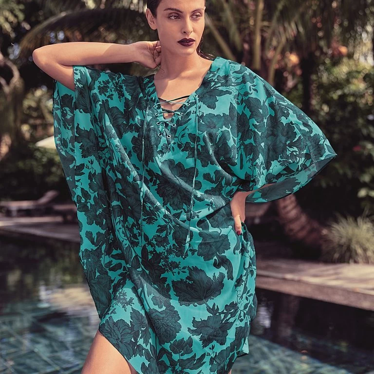 Ein absoluter Favorit! Die Atlanta-Tunika im Poncho-Look wird durch den farbenfrohen Lagunendruck aus der „Blue Lagoon“ Serie wunderschön aufgewertet. Ein kausaler übergroßer Schnitt ist sehr schmeichelhaft und die Brust wird mit einem hübschen Formteil und einer Schnürung am V-Ausschnitt verführerisch betont. Weicher Stoff und eine überschnittene Schulterpartie mit 3/4 Ärmeln machen dieses Strandaccessoire zu einem Must-Have.