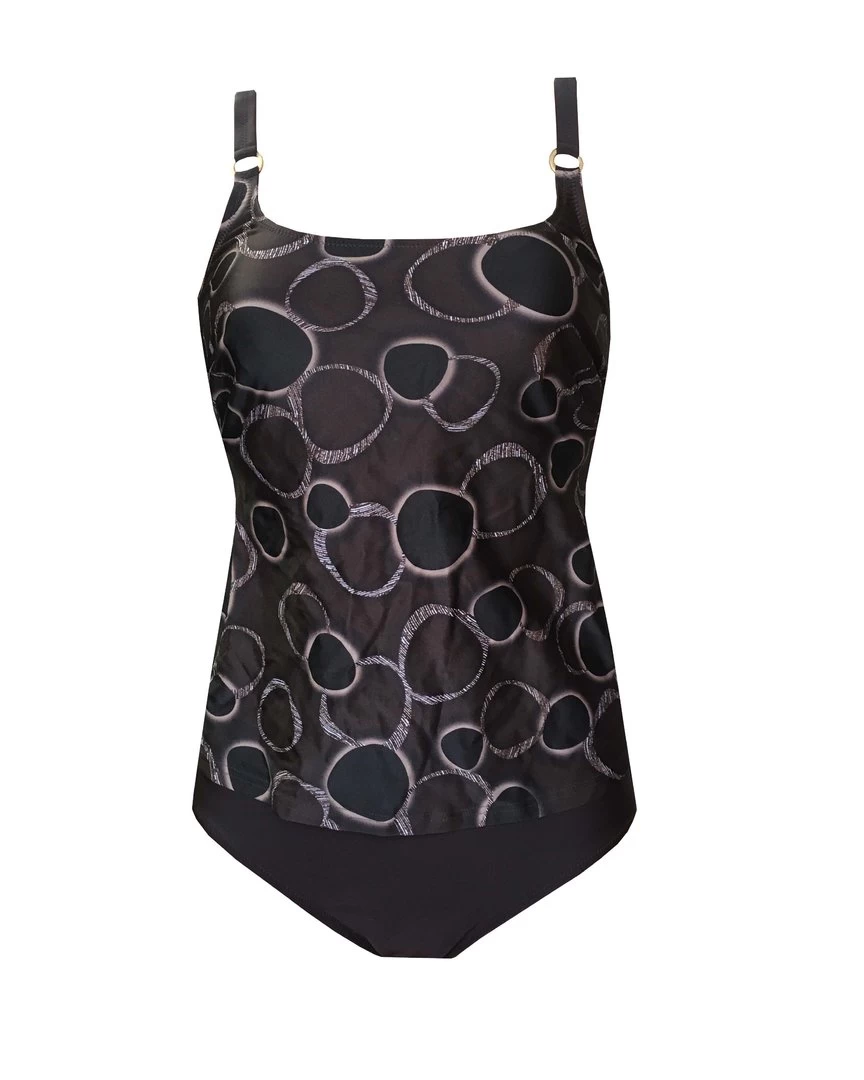 Schlichter Bügel-Tankini mit dezentem Muster in Brauntönen mit goldfarbenen Zierringen an den Trägern.
