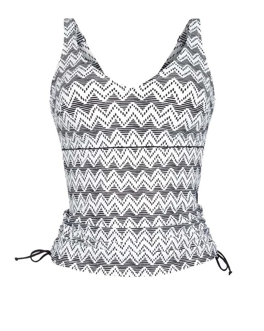 Das schwarz-weiße Tankini Top Malaika aus der Aluna Wave Kollektion mit verstellbarer Seitenlänge und eingearbeitetem Bügel gibt sicheren Halt. Nur Top, passende Hosen aus dem Mix & Match Programm.