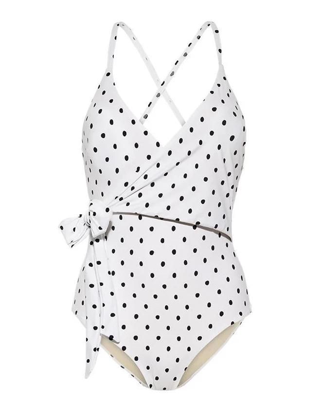 Ein toller Retro-Badeanzug mit Wickel-Optik in schwarz-weißem Polka Dot Print.
