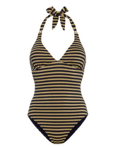 Ein Hauch von Luxus: Neckholder Badeanzug mit glitzernden goldenen Streifen. Auch als Bikini erhältlich.