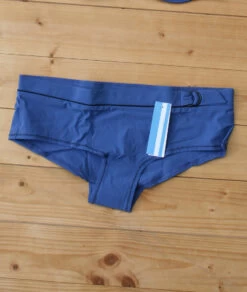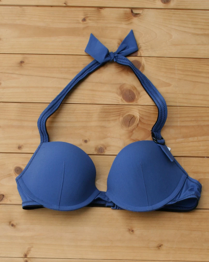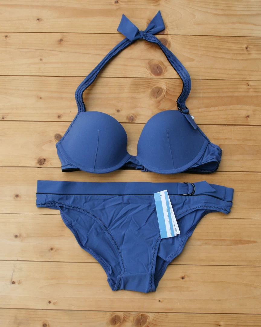 Sportlicher Bikini in elegantem Schwarz, Blau oder Grau mit verspielten kleinen Details. Das Push up Bikini Oberteil ist in den Cup Größen A und B und nur in Blau oder Schwarz erhältlich, im Nacken ist dieses zu binden und im Umfang durch eine Schnalle zu schließen.