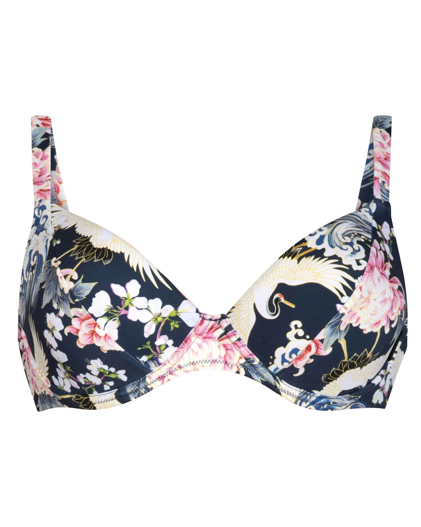Gute-Laune-Garant: Das tief dekolletierte Triangel Bikini Top Celine verzaubert mit einem asiatisch angehauchten Print aus Blüten und Kranichen auf blauem Grund. Für optimalen Halt und eine formschöne Silhouette sorgen stützende Bügel und verstellbare Träger. Cup C-H, Größe 36-44.